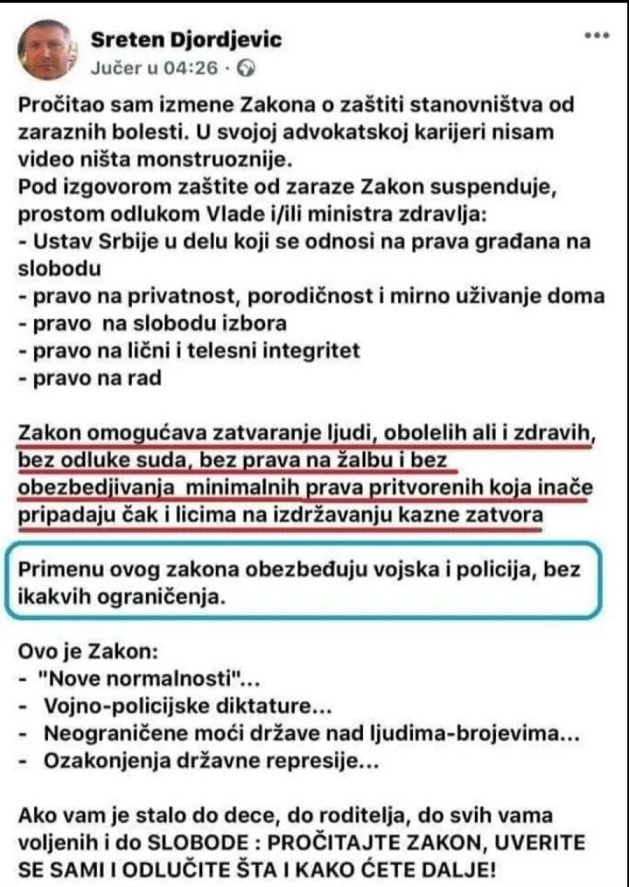 MMožete i kolektivno da podnesete takvu tužbu protiv predsednika države jer je on lično javno tvrdio preko svih medija do nedavno da kovid propusnice ne mogu da budu uvedene zbog Ustava i zakona. Vučić je sredinom jula rekao da "imamo Ustav koji kaže da su svi građani ravnopravni". On sada ćuti. Da li je Ustav prećutno suspendovan?